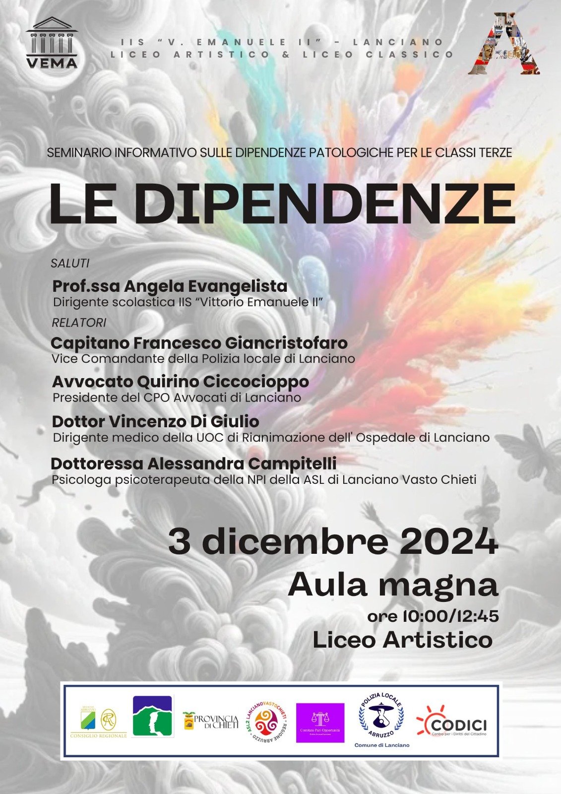 L'Associazione Codici Abruzzo prosegue con successo il ciclo di seminari informativi denominati “LE DIPENDENZE PATOLOGICHE”, un’iniziativa rivolta agli istituti superiori della Regione. Oggi, 3 dicembre, è stato il turno del Liceo Artistico di Lanciano, dove gli studenti hanno partecipato con attenzione e interesse agli incontri, affrontando il delicato tema delle dipendenze da sostanze stupefacenti.