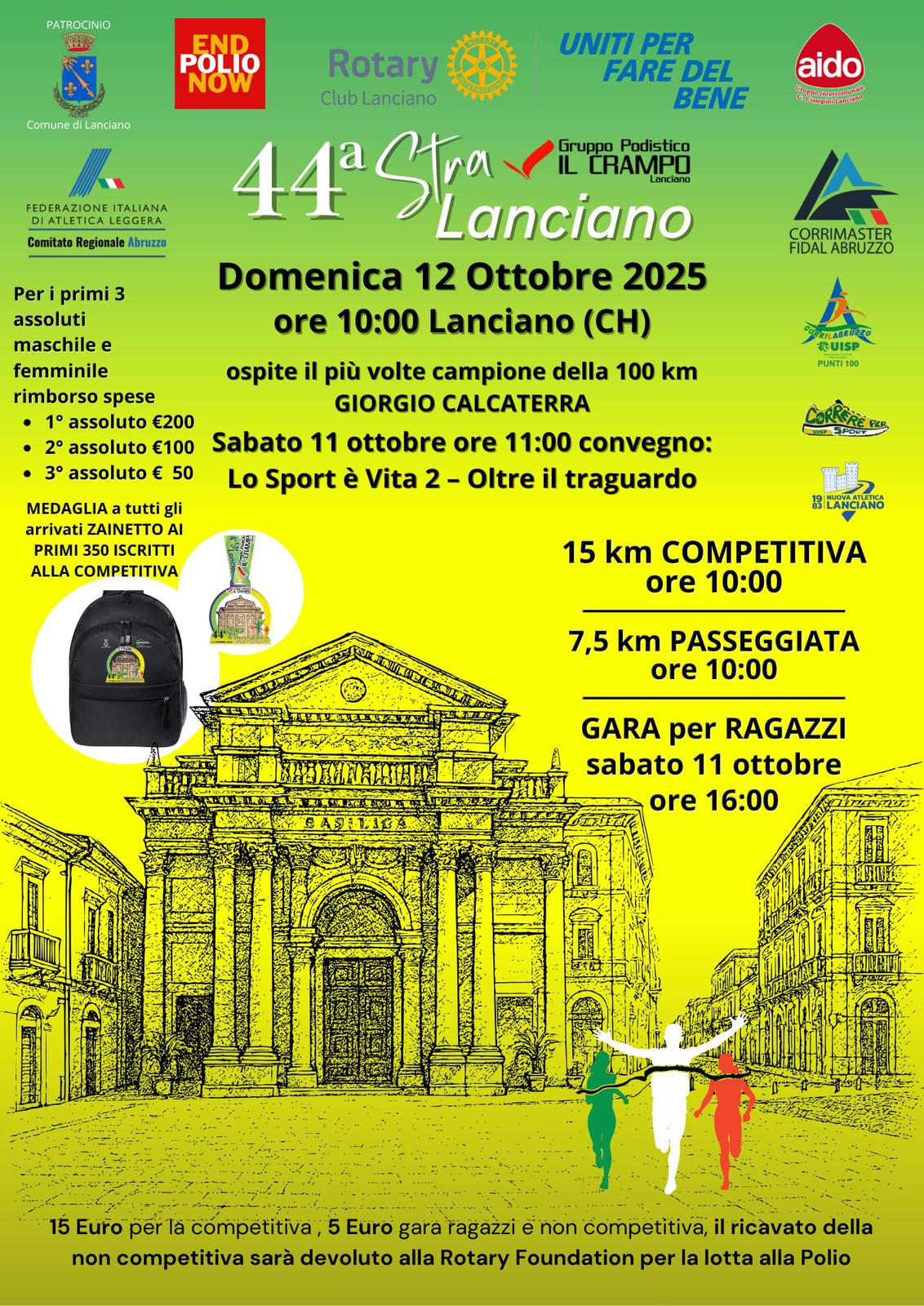 Sabato 11, alle ore 11, presso il Palazzo degli Studi, si terrà il convegno "Lo Sport è Vita - Oltre il traguardo". Alle 16 partirà la gara per ragazzi.