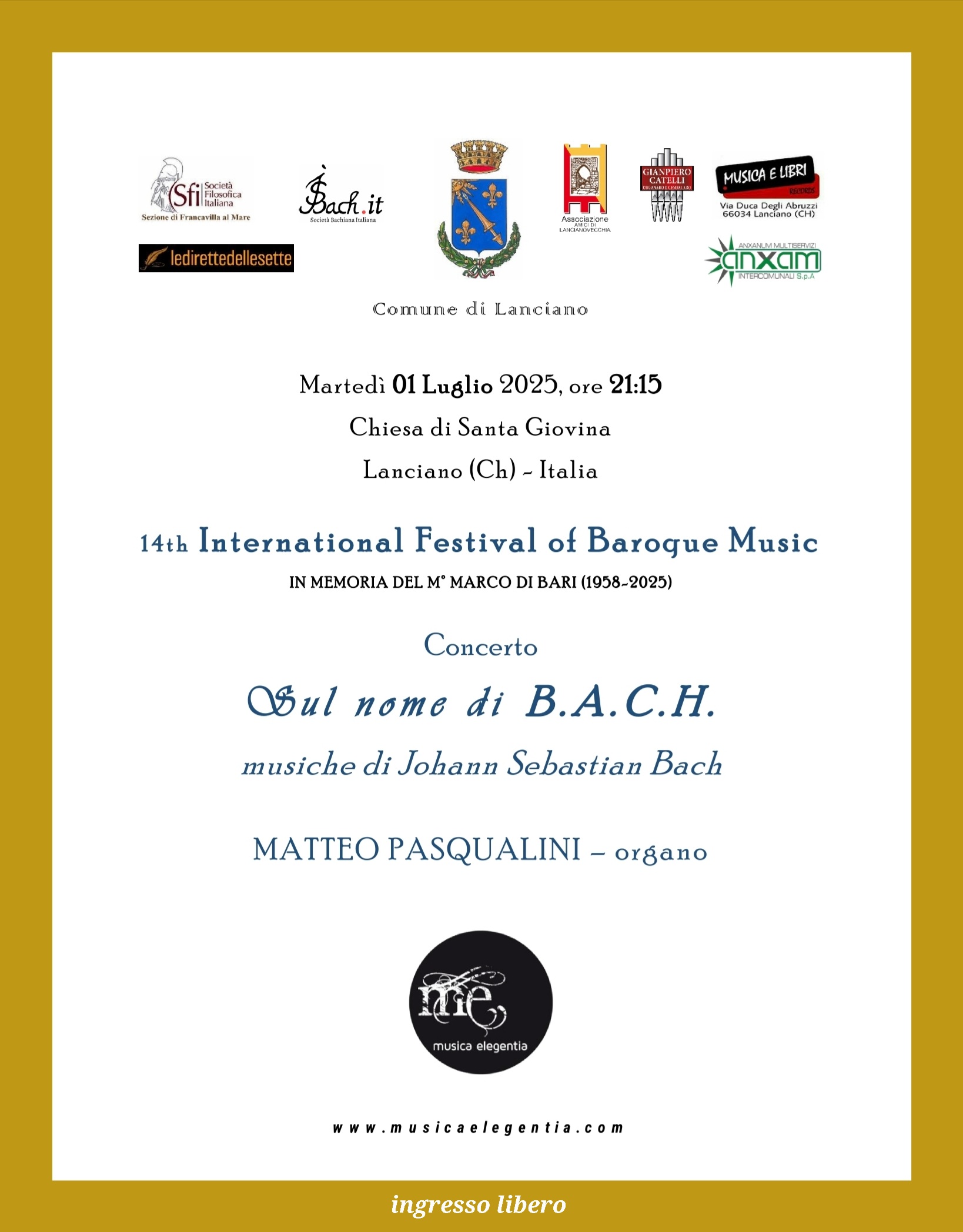 L’appuntamento, dal titolo “Sul nome di B.A.C.H.”, è dedicato alle musiche di Johann Sebastian Bach, in occasione del 340° anniversario della nascita del celebre compositore del tardo barocco.