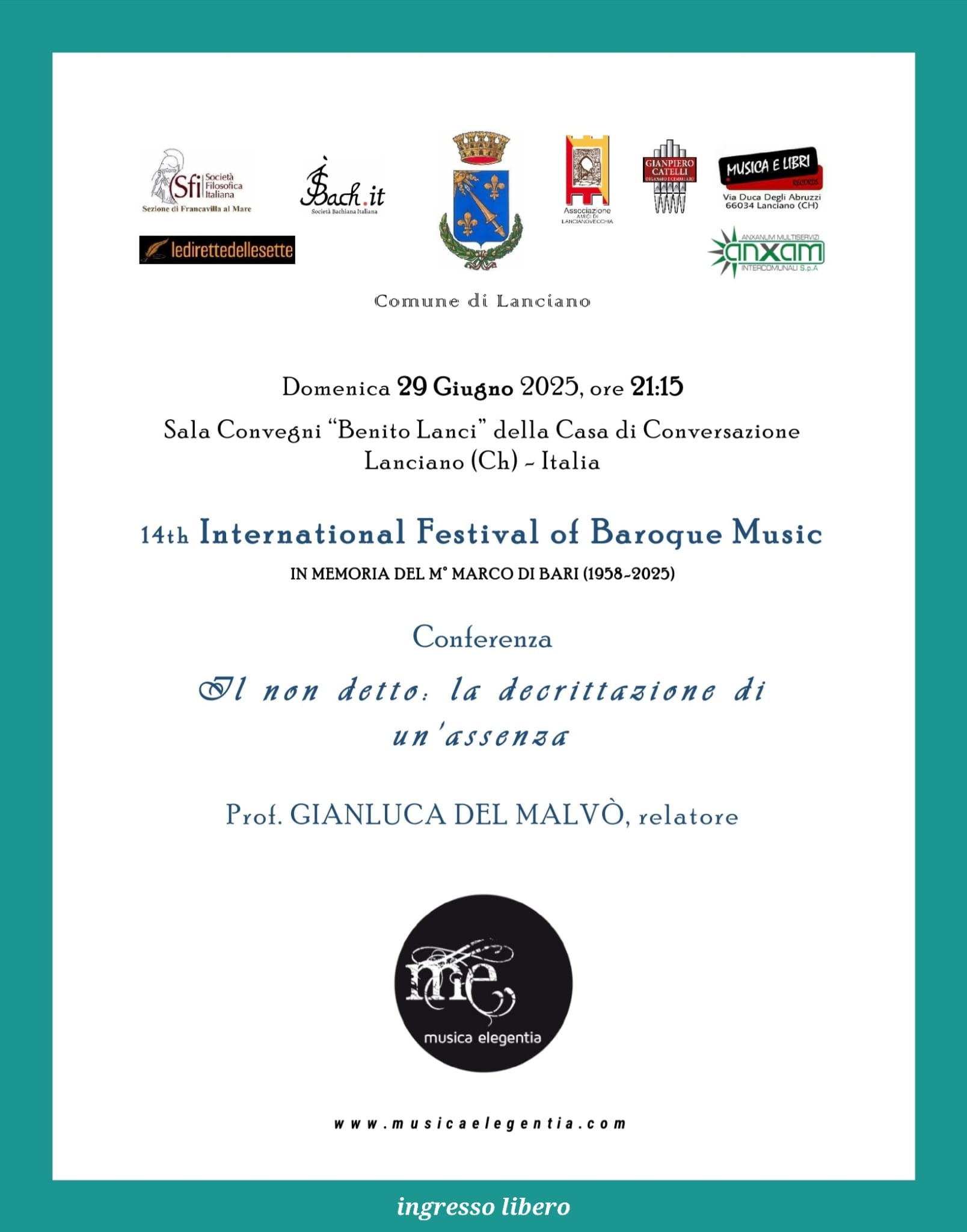 Iniziativa di cui fa parte International Festival of Baroque Music 14th edition 14^ Festival internazionale di musica baroccaDirezione artistica: M° Matteo Cicchitti International Festival of Baroque Music 14th edition