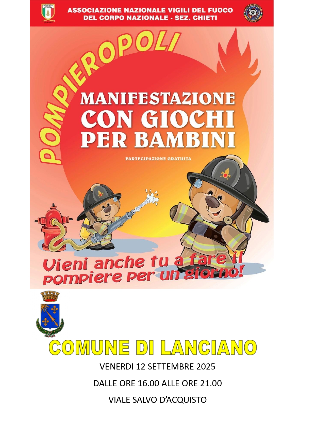 Cos'è Manifestazione con giochi e attrazioni per bambini che potranno diventare pompieri per un giorno.