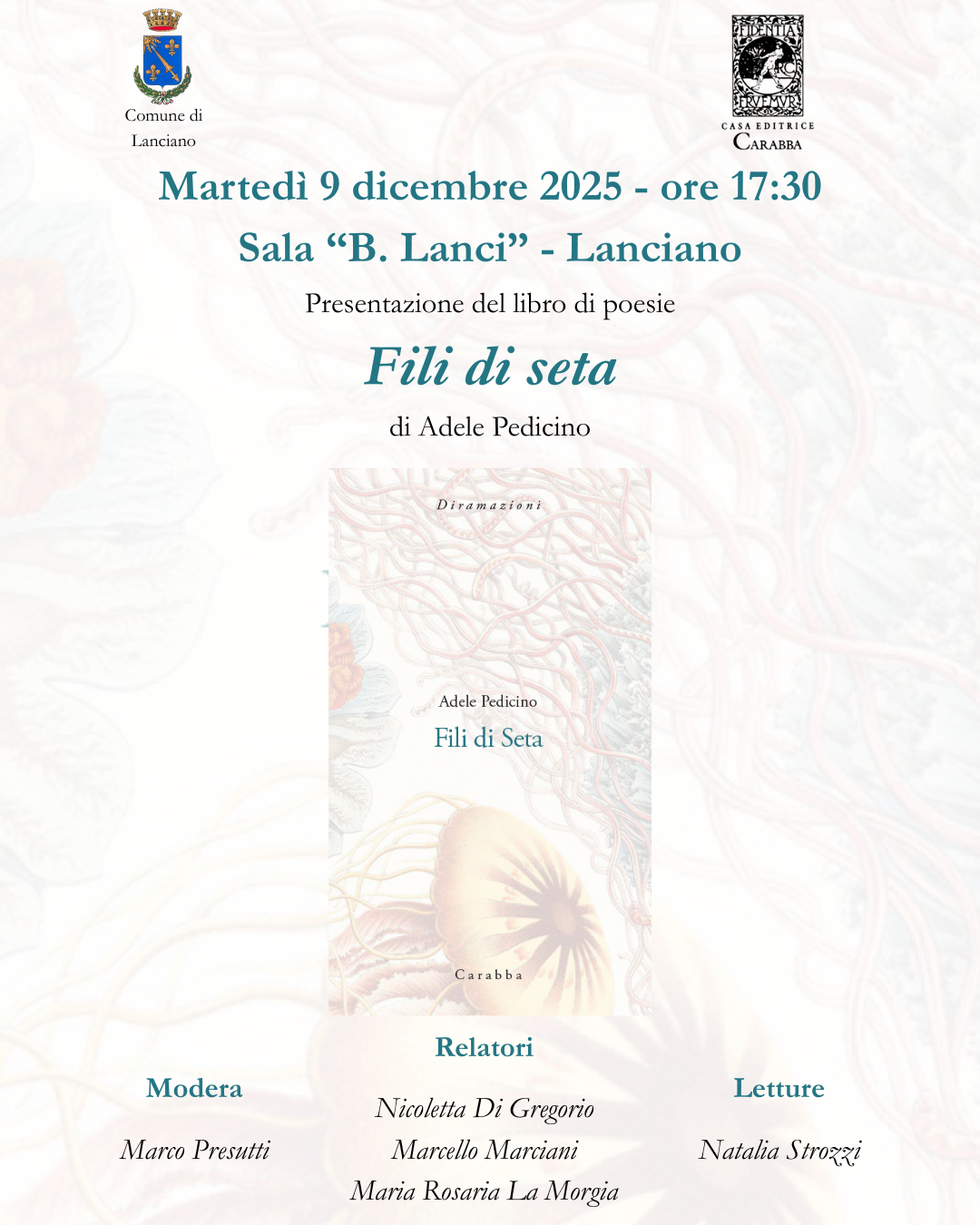 Martedì 9 dicembre 2025 alle ore 17:30 presso la Casa di Conversazione (Sala "B. Lanci") si terrà la presentazione del libro di poesia "Fili di seta" di Adele Pedicino. Modera l'evento Marco Presutti. Intervengono Nicoletta Di Gregorio, Marcello Marciani e Maria Rosaria La Morgia. Le letture sono a cura di Natalia Strozzi.