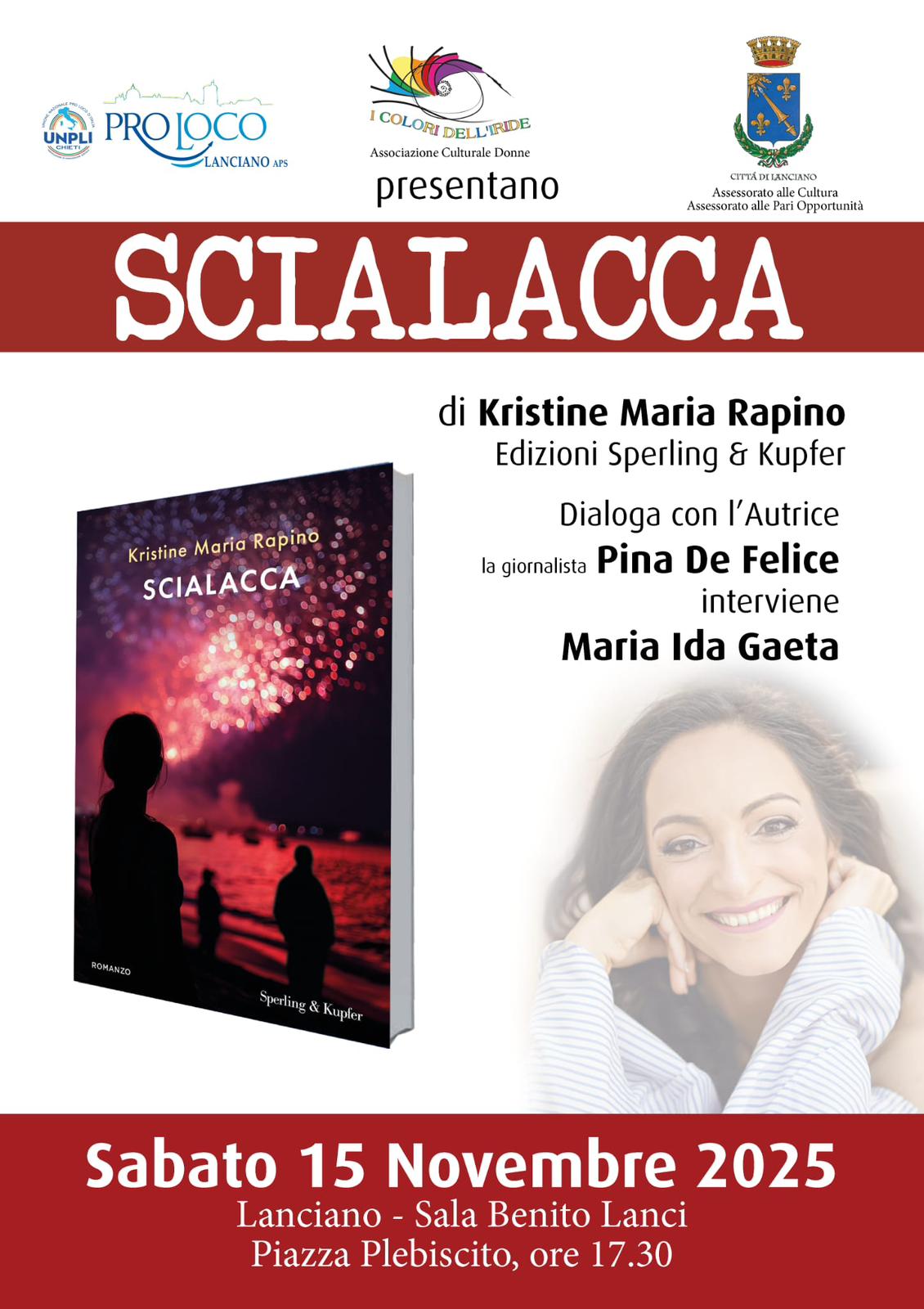 Sabato 15 novembre, alle 17.30, presso la Sala "Benito Lanci" della ex Casa di Conversazione, sarà presentato il nuovo romanzo di Kristine Maria Rapino, “Scialacca”, edito da Sperling & Kupfer. Dialogherà con l'autrice la giornalista Pina De Felice. Interverrà Maria Ida Gaeta.