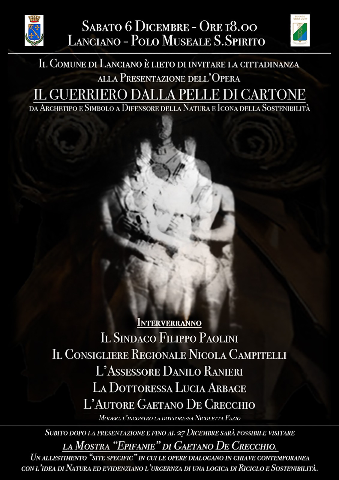 Sabato 6 dicembre, alle 18, presso il Polo Museale Santo Spirito, sarà presentata l'opera "Il Guerriero dalla pelle di cartone" di Gaetano De Crecchio e verrà inaugurata, dello stesso autore, la mostra "Epifanie", che sarà possibile visitare fino al 27 dicembre.