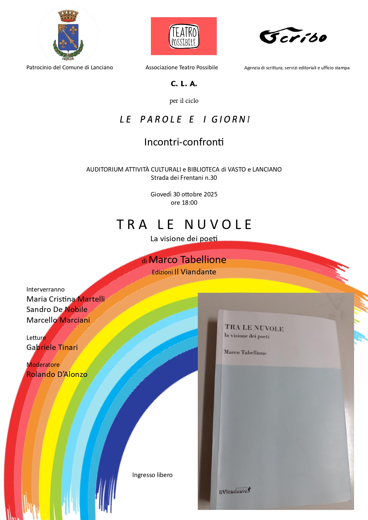Giovedì 30 ottobre, alle 18, presso la Biblioteca Regionale, in via dei Frentani n° 30, incontro/dibattito sul libro "Tra le nuvole. La visione dei poeti" di Marco Tabellione, edito dalla casa editrice IlViandante.