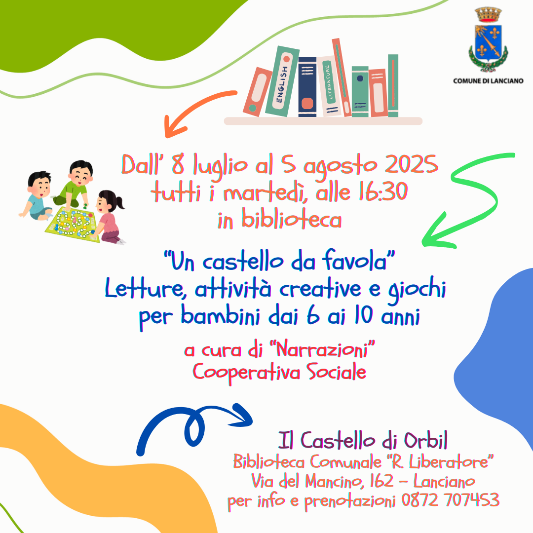 Il Castello di Orbil, sezione ragazzi della Biblioteca Comunale "Raffaele Liberatore", propone per l'estate 2025: letture, attività creative e giochi per bambini dai 6 ai 10 anni